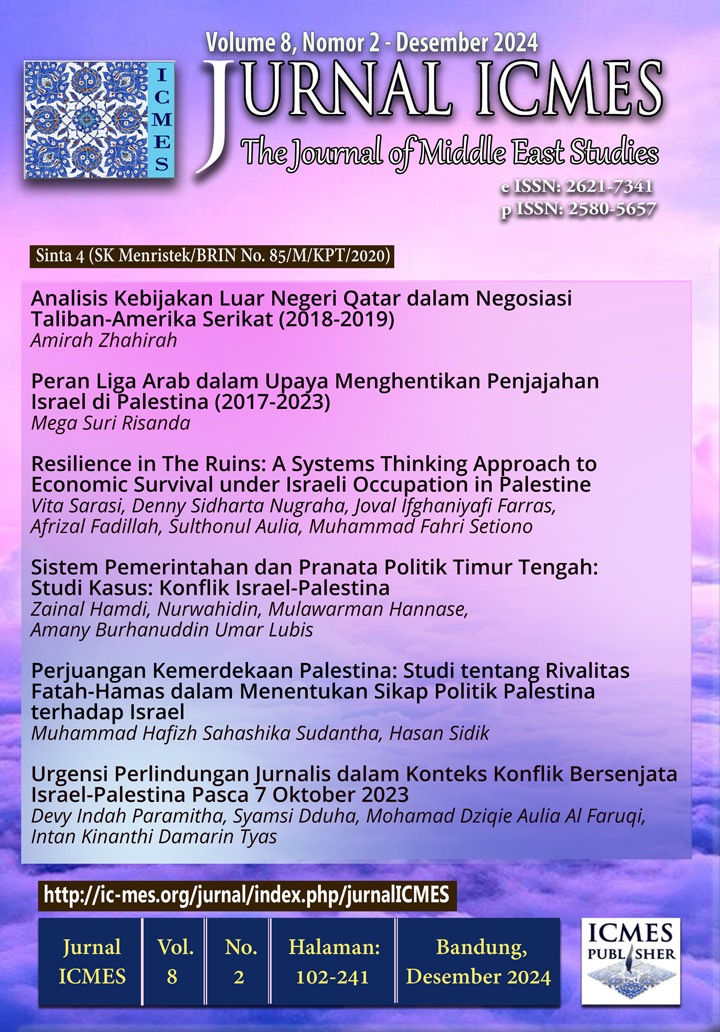 In this issue, there are six articles discussing various interesting things, titled Analysis of Qatar's Foreign Policy in the Taliban-United States Negotiations (2018-2019); The Role of the Arab League in Stopping Israeli Occupation in Palestine (2017-2023); Resilience in The Ruins: A Systems Thinking Approach to Economic Survival under Israeli Occupation in Palestine; The System of Government and Political Institutions in the Middle East: A Case Study of the Israel-Palestine Conflict; The Struggle for Palestinian Independence: A Study of Rivalry Fatah-Hamas in Determining Palestine's Political Attitude Towards Israel; and Urgency of Journalist Protection in the Context of the Israeli-Palestinian Armed Conflict Post-October 7, 2023. Hopefully, these articles will contribute to the knowledge and understanding of the Middle East. We invites academics and researchers to submit the results of their studies on Middle Eastern issues from various dimensions, from politics to culture. Instructions for submitting articles can be read at this link.